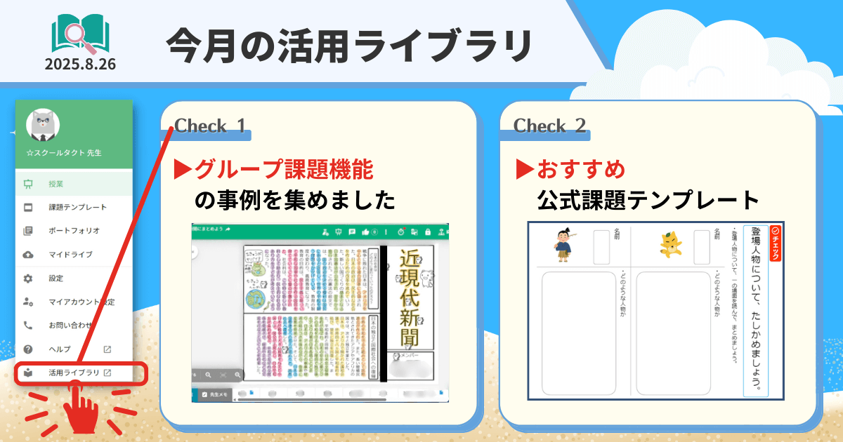 ほかにも活用ライブラリには、季節ごとに使えるテンプレートやシンキングツール、振り返りに役立つ課題も登録されています。ぜひチェックしてみてくださいね。