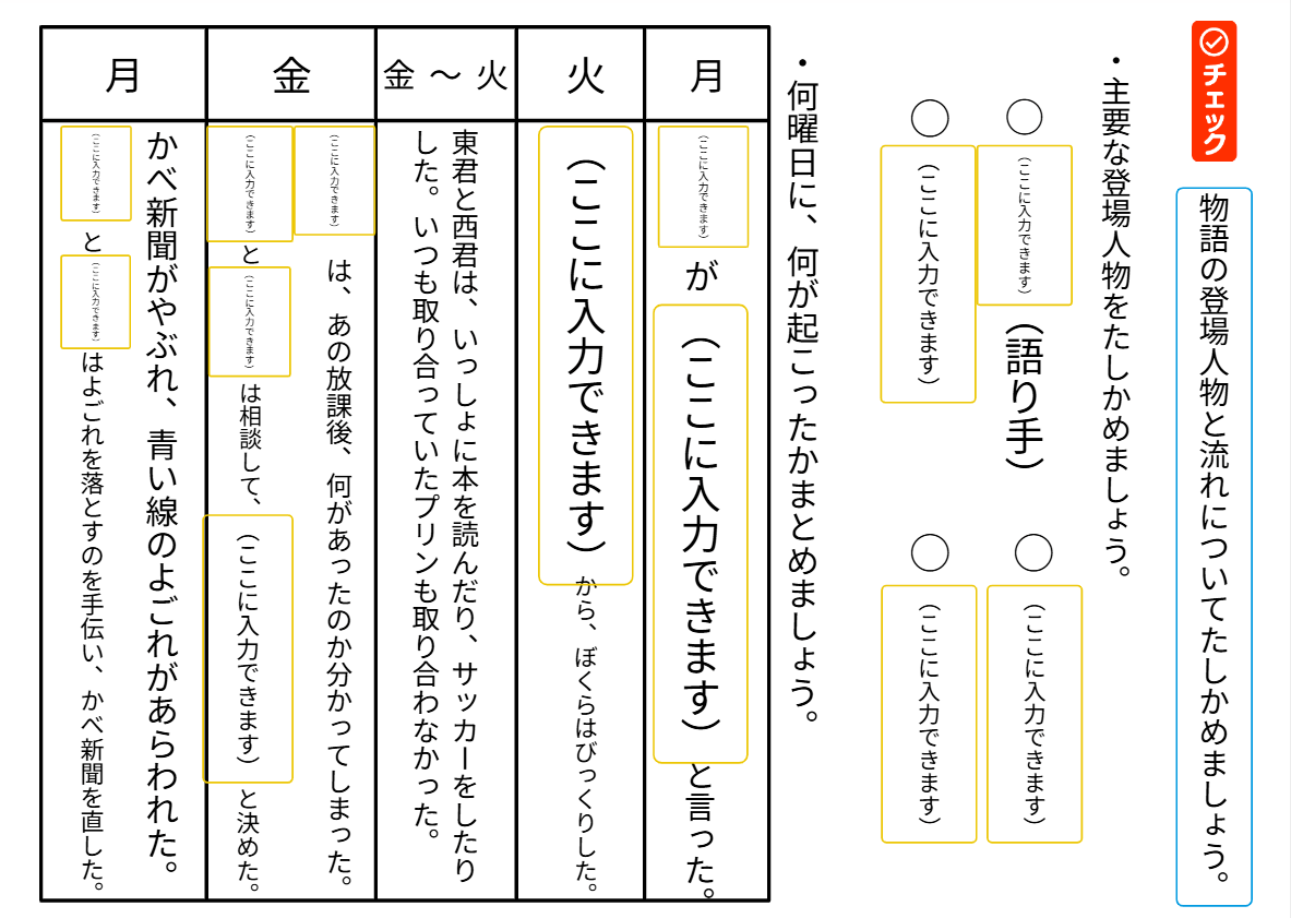 物語「友情のかべ新聞」の主要な登場人物と「語り手」を特定し、物語の中で起きた出来事を時系列(曜日ごと)に沿って整理する課題です。