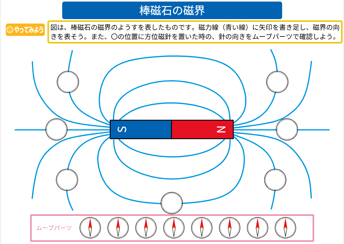 棒磁石の磁界の様子を表した図に、磁力線(青い線)の矢印を書き足し、磁界の向きを表します。 また、〇の位置に方位磁針を置いた時の、針の向きをムーブパーツで確認できます。