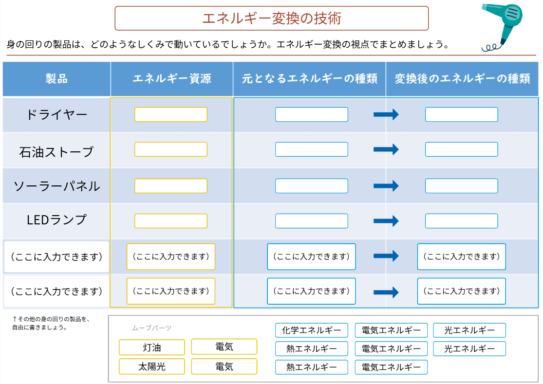 技術科「エネルギー変換の技術」の授業で使います。 身の回りの製品は、どのような仕組みで動いているでしょうか。それをエネルギー変換の視点でまとめます。