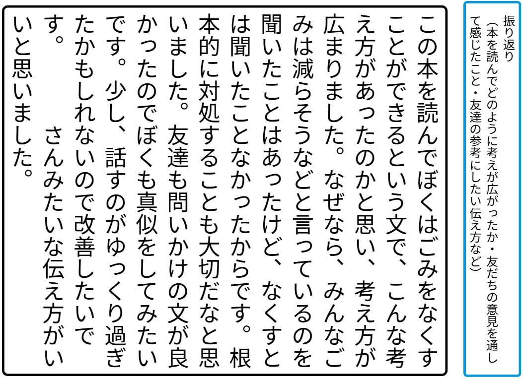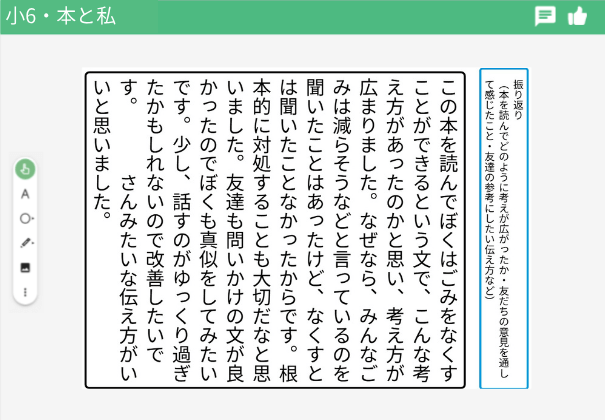 クラスメートが事前に作成したブックトーク動画を視聴します 。児童は、①良かった点(伝え方)、②良かった点(内容)、③アドバイスの3つの観点から、コメントをします。