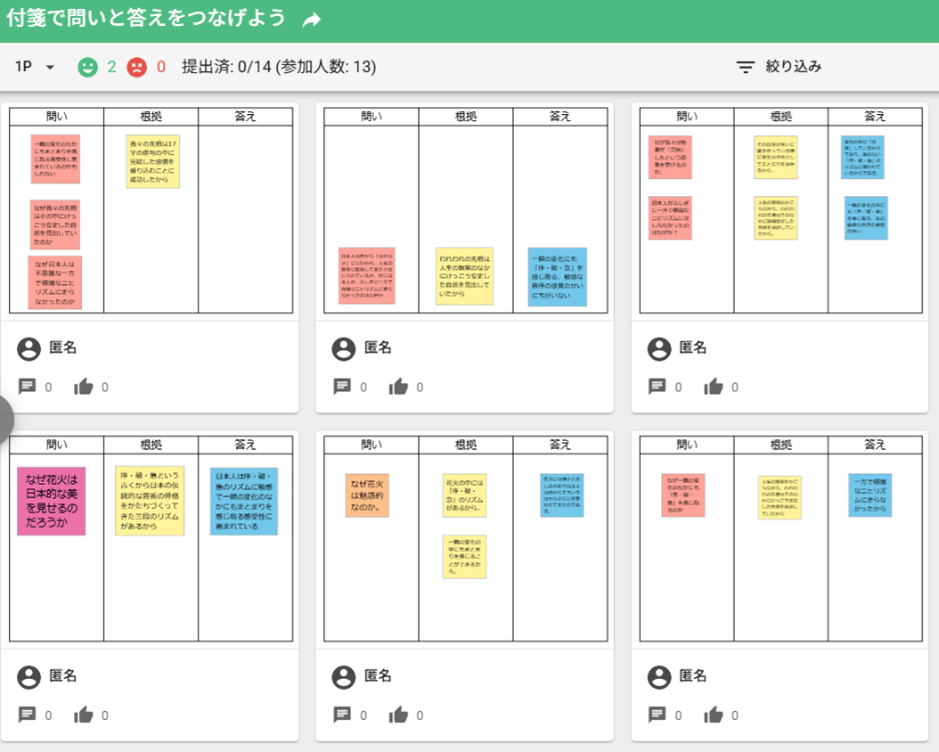 本文の範読の後、生徒は「問い」「根拠」「答え」にあたる部分を文章中から探し、それぞれ付箋ツールに書き写します。そして、作成した付箋をキャンバスで並び替えて情報を整理しました 。