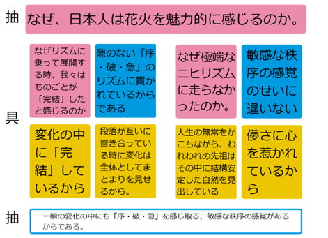そして本時は、この構造モデルを使って、題材である「無常のリズム」の本文を構造化していくと生徒に伝えました 。