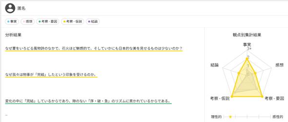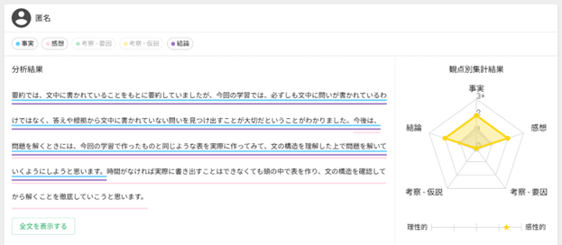 生徒は自身が構造化した文章を振り返りAI分析にかけます 。そして、「問い」が「考察ー仮説」、「根拠」が「考察-要因」といったように、意図した観点が分析結果に現れているかを確認し、自分の読解を客観的に見つめ直す時間を取りました 。