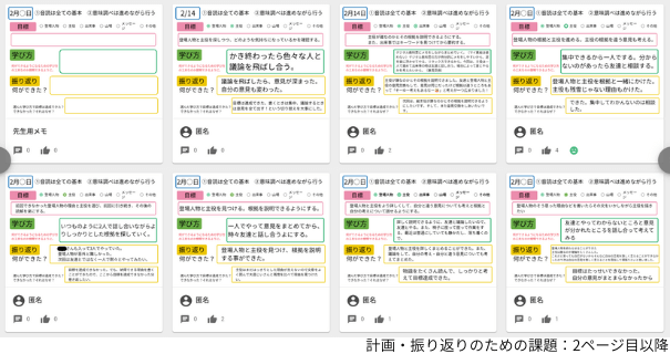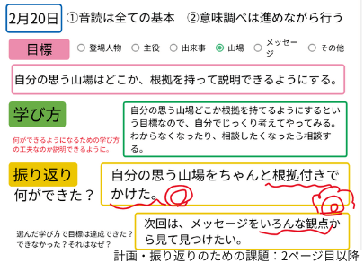 児童は、配布されたスクールタクトの2枚目以降にある計画・振り返りフォームに、毎回の目標と学び方の計画を記入してから読解に取り組みます。一人で行う子、友達と協力する子、一人でやったり友達に聞いたりする子など、学び方はさまざまです。