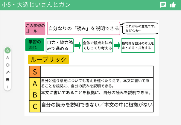 これまでの物語文の学習を振り返り、どのような読みの観点を使って解釈してきたかを確認しました。そのうえで今回は、先生の指示なしに自分たちで取り組み、自分が最も納得できる解釈(「自分の読み」)を説明できることがゴールであることを伝えました。