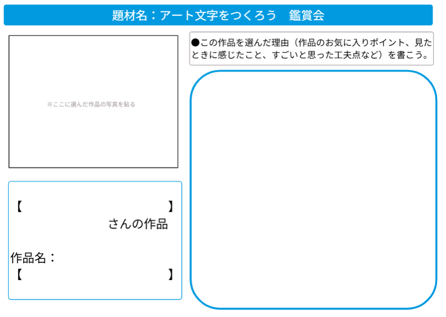 最初に、用意しておいた課題を配布し、授業の目的を説明しました。この課題には、鑑賞する作品を貼るスペースと、「作品を選んだ理由」や「作品から感じたこと」などを書き込める回答欄を用意しています。