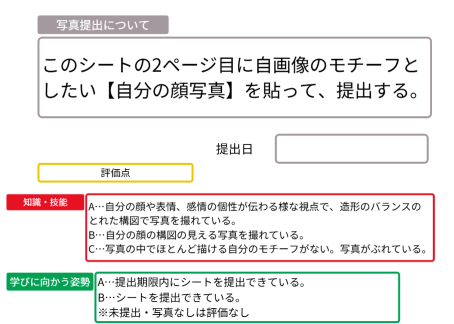 配布した課題には今回の単元の評価点も記載してあるため、生徒はポイントを意識しながら制作に取り組むことができました。