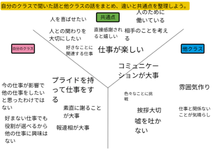 地域の方を複数名講師としてお招きし、仕事についての講話をしていただきました。生徒は班ごとに分かれてローテーションで話を伺い、質疑応答を行いながら重要なポイントをキャンバスに記録します。