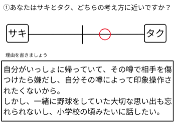 二人の登場人物の考え方に対して、自分はどう考えるのかを「心の数直線」を使って表す実践です。