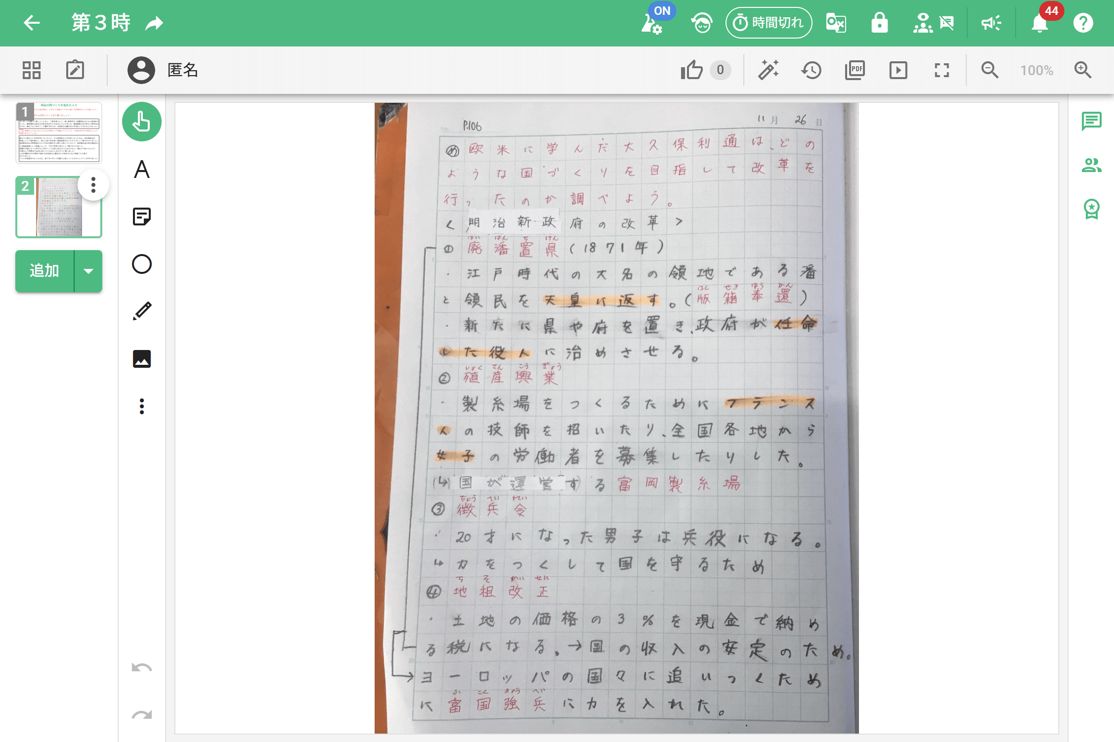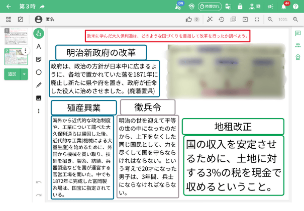 明治政府が行った諸改革について、児童が自ら「学習形態(個人・ペア・グループ)」と「まとめ方(ノート・デジタル)」を選択して追究する学習実践です。以下は全七時間の単元のうち、第三時の実践についてまとめています。