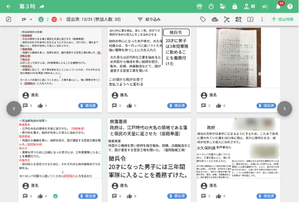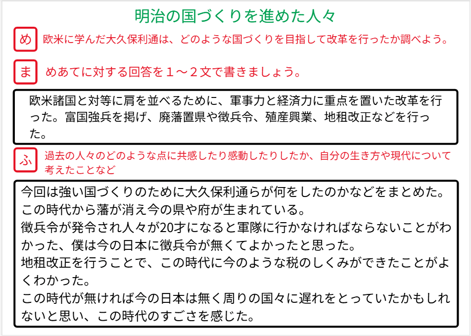 授業の終末には、本時の学習を振り返ります。 教員は「過去の人々のどのような点に共感したか」「現代の社会とどうつながっているか」という具体的な視点を示し、児童がスクールタクトのキャンバスへ振り返りを記入しました。記入された振り返りは、次時の導入で活用されるため、児童は互いの学びを継続的に共有し合うことができます。
